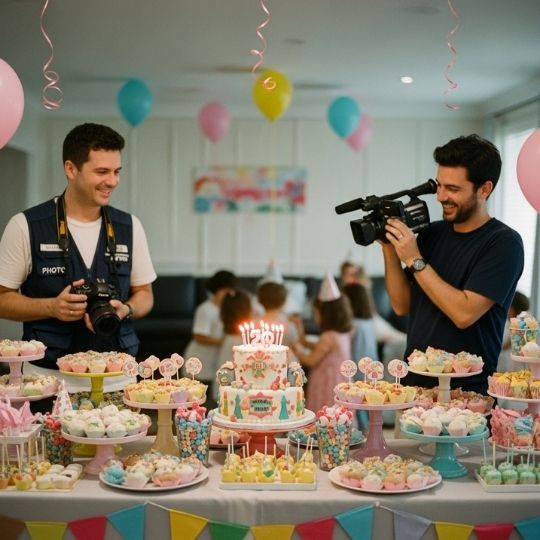 Registro Completo de Detalhes e Ambiente. Além das pessoas, temos um olhar atento para tudo que compôs a festa. Fotografamos os detalhes da decoração, o bolo, a mesa de doces, os presentes e a ambientação. Garantimos que o clima e o investimento colocados na festa também sejam eternizados.